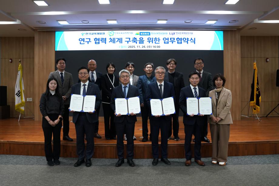한국조세재정연구원(원장 이영)은 2025년 12월 26일(수) 한국조세재정연구원 별관 3층 대강당에서 한국교육개발원·한국교육과정평가원·한국교육학술정보원과 연구 협력체계 구축을 위한 업무협약(MOU)을 체결하였습니다.