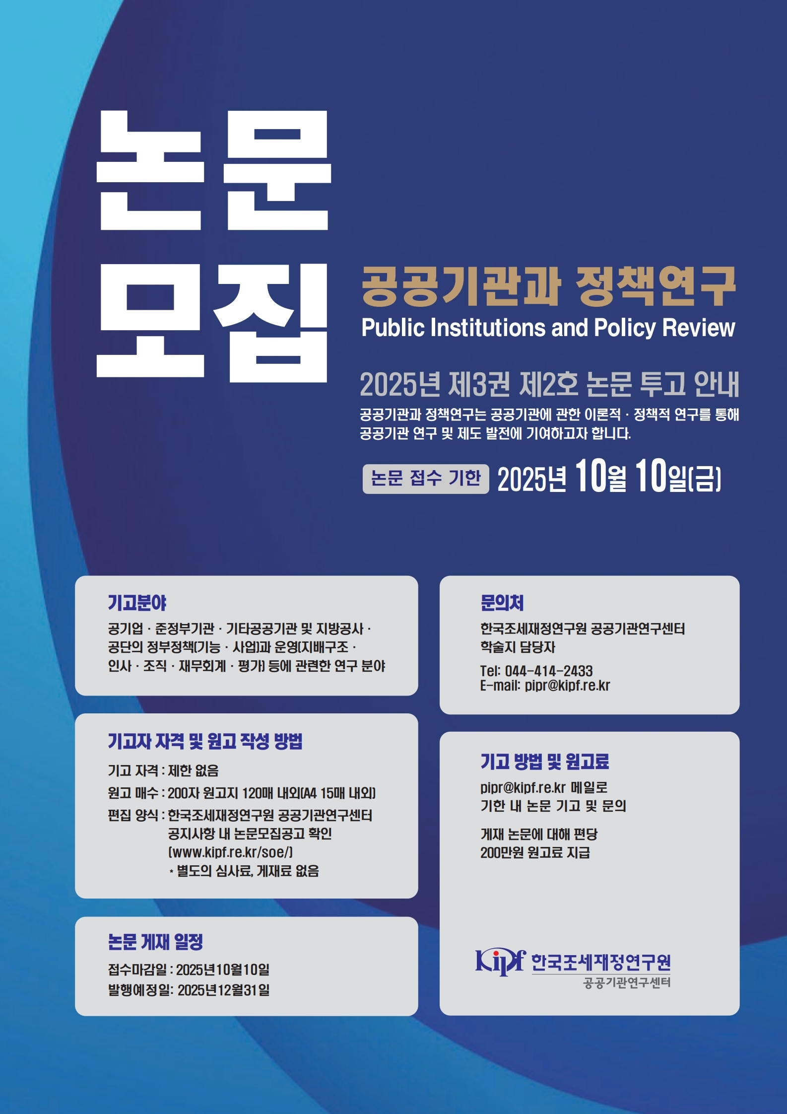 「공공기관과 정책연구」 2025년 제3권 제2호에 수록할 논문을 모집하오니, 많은 관심바랍니다.