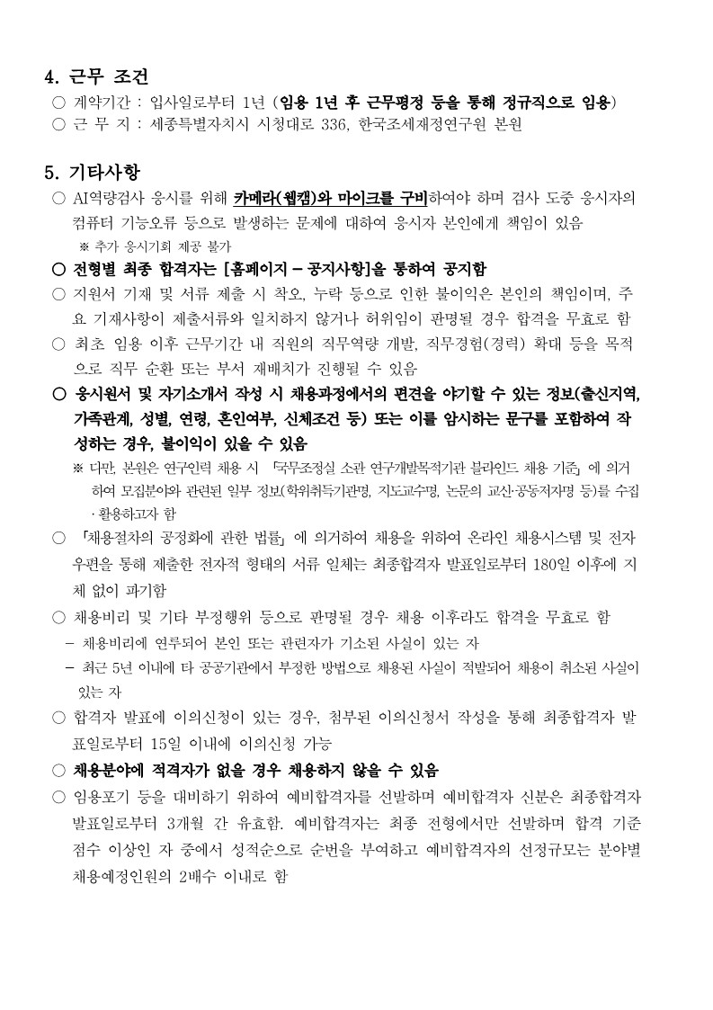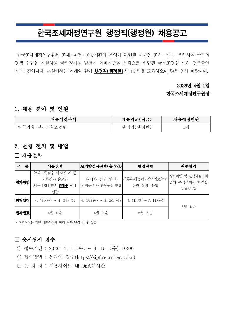 한국조세재정연구원과 함께할 능력 있고 열정적인 인재를 모집합니다. 공개채용을 원칙으로 하며, 연구원 홈페이지 또는 취업사이트에 공고하며 1차 합격자 면접 일시 및 장소는 본원 홈페이지 (공지사항 게시판)에 공고합니다.