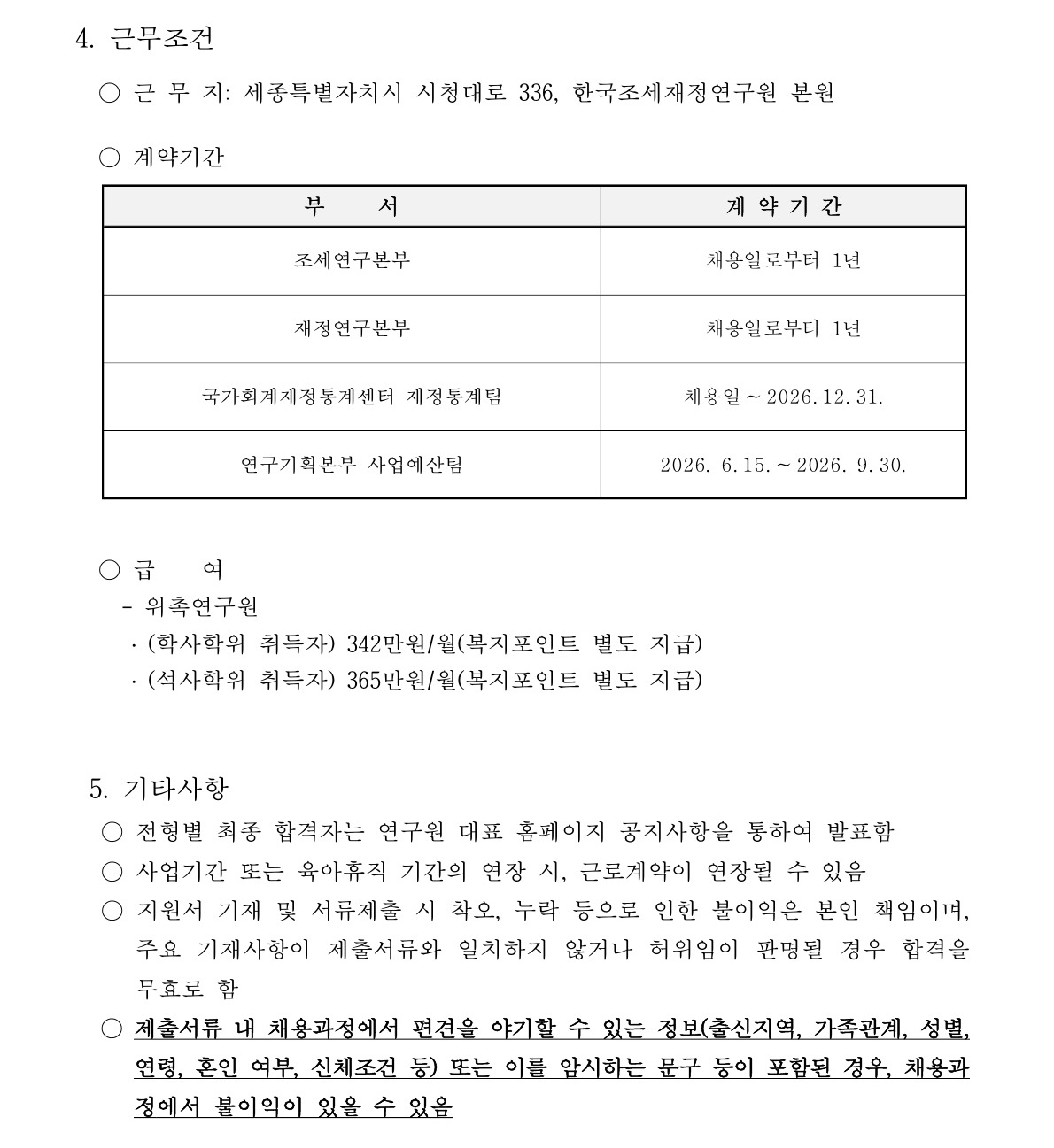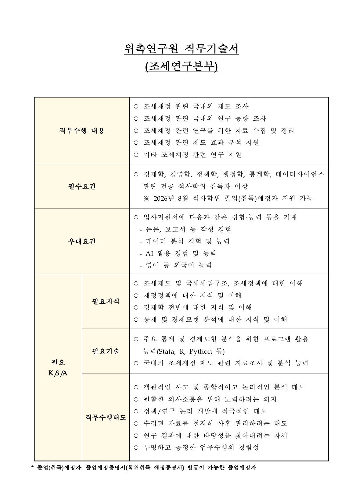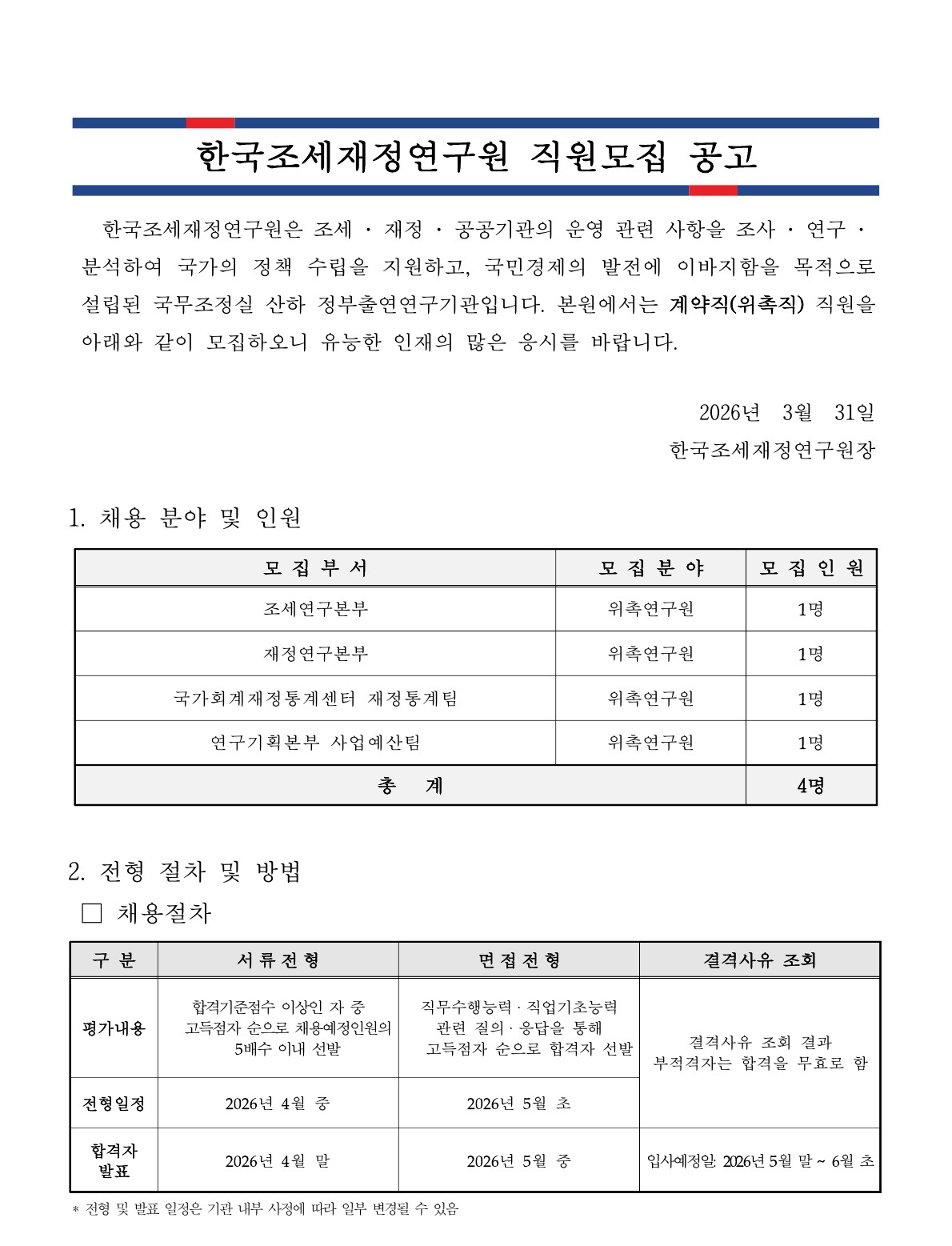 한국조세재정연구원과 함께할 능력 있고 열정적인 인재를 모집합니다. 공개채용을 원칙으로 하며, 연구원 홈페이지 또는 취업사이트에 공고하며 1차 합격자 면접 일시 및 장소는 본원 홈페이지 (공지사항 게시판)에 공고합니다.